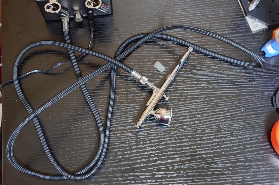 エアブラシの接続ホースはメッシュカバーされていて、長さが2mくらいあるんじゃないかな。