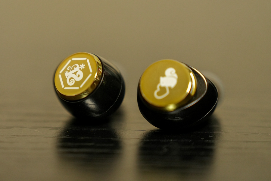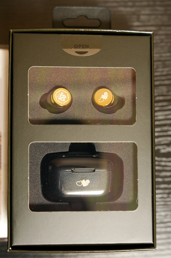 イヤホンは左右でプレートのプリントが異なっていますが、知らないとただのメーカーのロゴとかに見えるんじゃないかと思います。