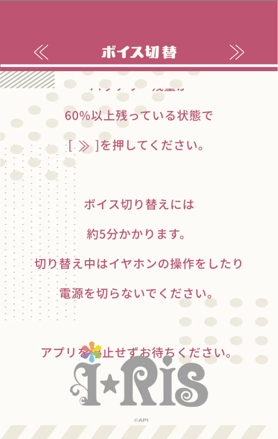 他のコラボモデルのワイヤレスイヤホンと同様に電源のON/OFFや各動作のガイダンスをi☆Risのメンバー5人が担当しています。