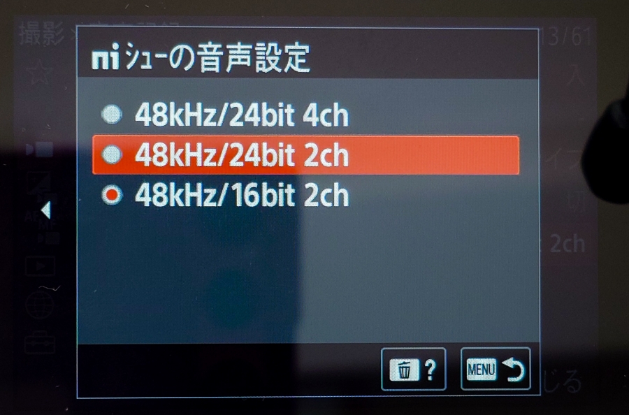 α7CRのデフォルトが48kHz/16bit 2chになっていた(もしかしたら弄ってたかもしれないけど)ので、48kHz/24bit 2chに変更しました。