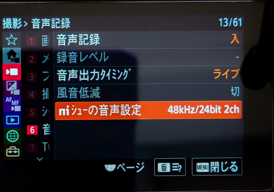 カメラ側の設定はカメラのスイッチを動画撮影に切り替えてから、メニューの撮影ー音声記録にあるこの部分を設定します。