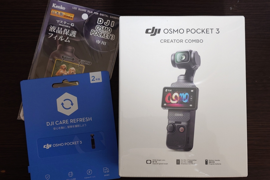 写真の通りで、クリエイターコンボとケンコーの液晶保護フィルム、DJIケアリフレッシュの2年版をまとめて購入。