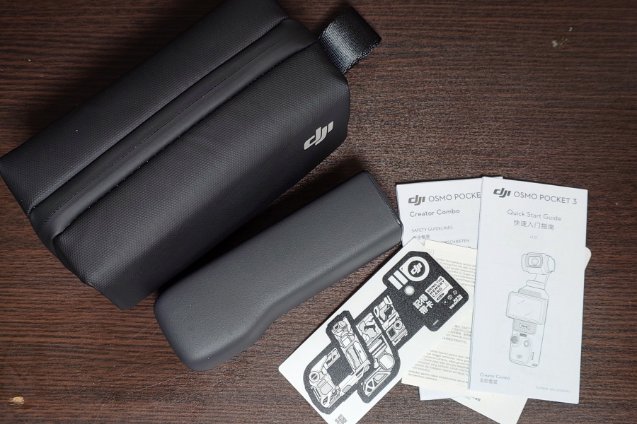 Osmo Pocket 3 クリエイターコンボのボックスを開くと、本体カバーとセット一式がはいる携帯ポーチ、簡易マニュアルやステッカーが入っています。