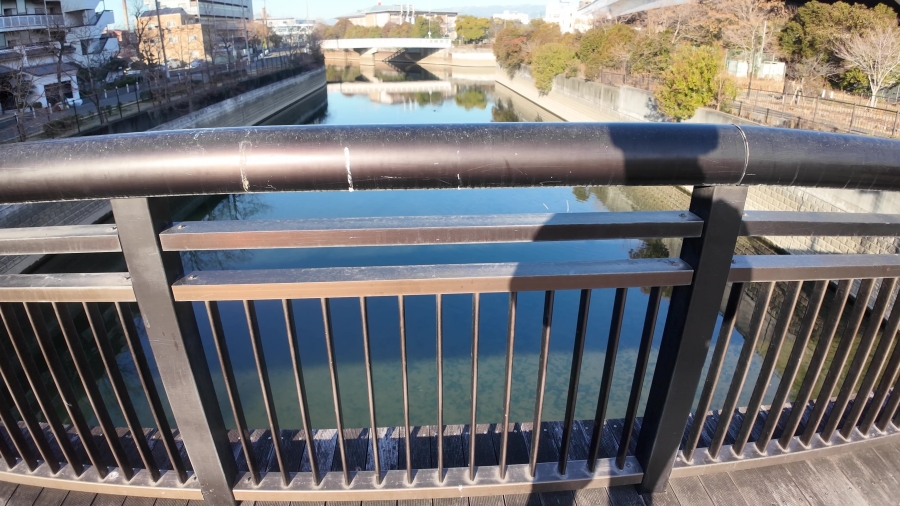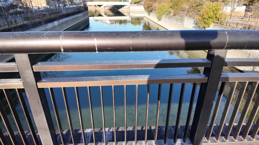 太鼓状の橋なので、標準でも右の欄干が少し下向きになっているんですが、ワイドアングルレンズを付けると端に行くほど歪みが酷いのが分かると思います。