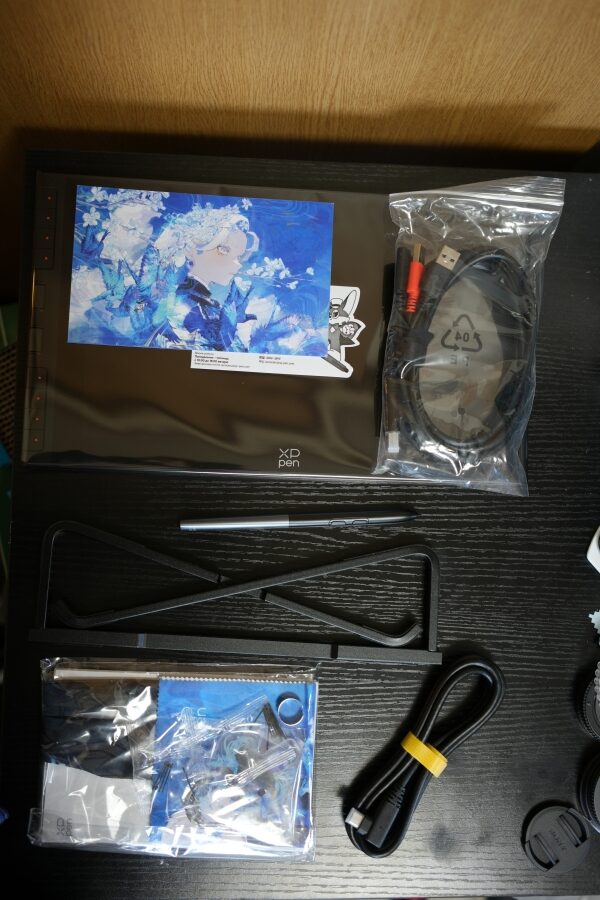 液タブ本体にパッケージイラストのポストカード、Type-Cケーブルで映像出力等ができない機種用の3in1タイプのケーブル(PCのHDMI端子を使用)、Type-C接続のフルスペックケーブル、スタンド、ペン、そして細々としたものがまとめられています。