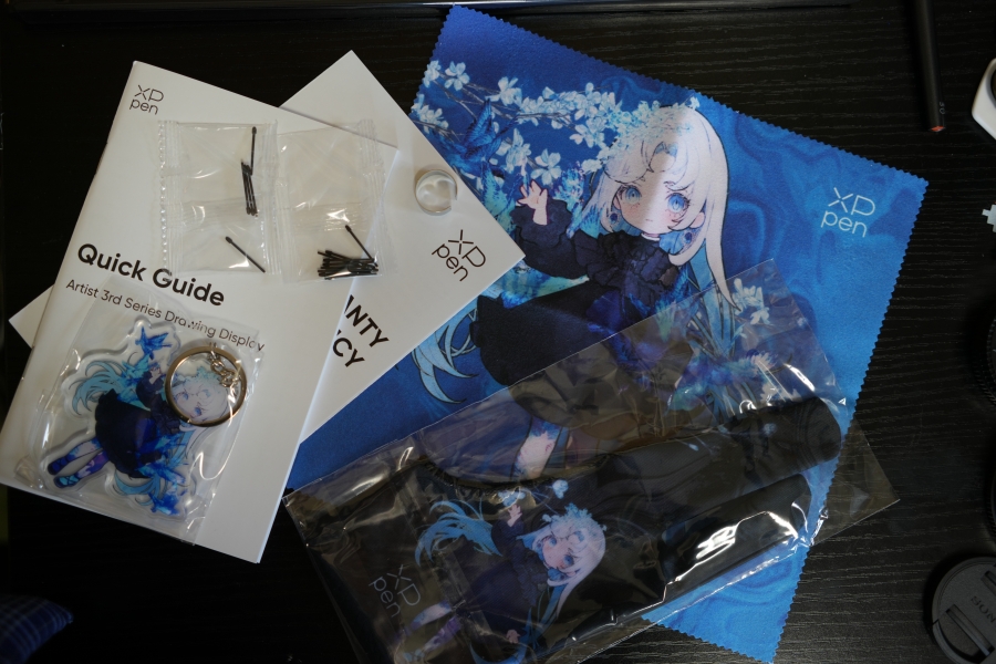 取説や交換用のペン先、ペン先の取り外し用のピンセット、イラスト入りのクロスにアクリルキーホルダー、小指と薬指だけを保護する形の手袋。